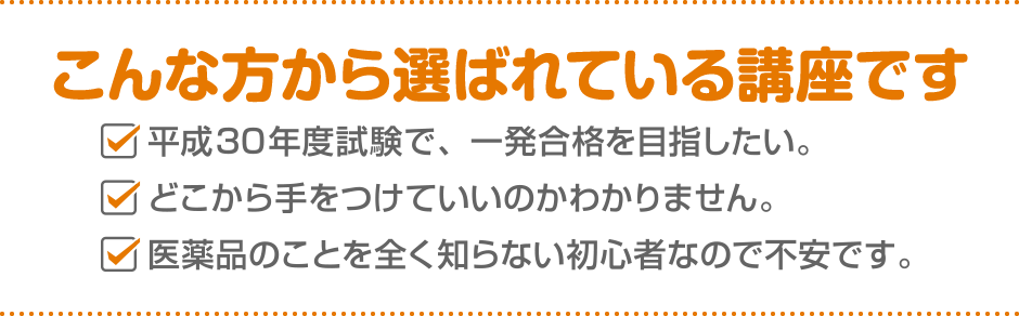 本講座は、「復習」に力を入れたカリキュラム。各章ごとに確認テストを行い、理解度を明確にしながら進むので、お薬の知識がない方でも着実に知識を積み重ねることができます。また、教室でのライブ授業に加えて、復習用の動画授業をパソコン・タブレット・スマートフォンでいつでも受講できるのが特徴です。出題範囲の広い登録販売者試験は、十分な学習期間を確保するのが合格の鍵!お申込み後、1週間程度で教材をご自宅にお送りするので、予習の時間もたっぷり取っていただけます。
